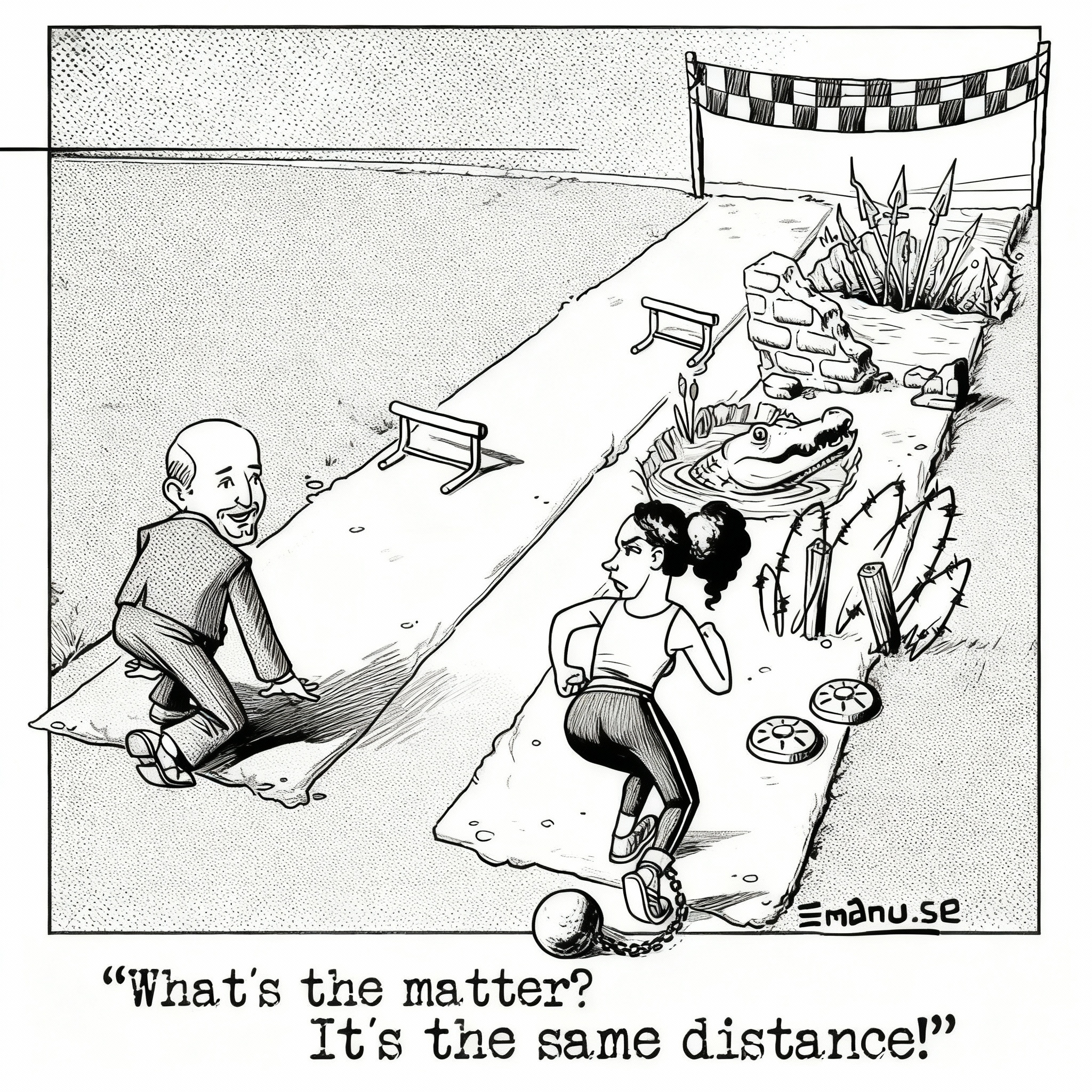 The message is clear and, it seems to me, valid: if you’re young, and/or a woman, and/or a person of color in the US, you face obstacles that you wouldn’t face if you’re old, white and male. And if you’re old, white and male, and you don’t acknowledge the differences, then you’re seriously ignorant about the realities of life. The message needn’t be quite so on-the-nose about the demographic categories involved — though I think that these particular demographic stereotypes aren’t totally false, either — but it’s definitely meant to be a comment on the nature of privilege.